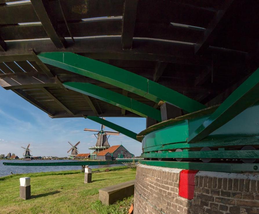 Er was een tijd dat je meer dan 200 zaagmolens in de Zaanstreek kon zien. De eerste werden gebouwd tussen 1614-1618 en nog veel meer zouden daarna volgen. In die tijd was alles uit hout opgetrokken, dus aan mechanische zaagmolens was een groot behoefte. Helaas zijn er nog maar twee over. Een van deze twee overlevenden De Gekroonde Poelenburg is een zogenaamde paltrokmolen. Deze zaagmolens hebben een open structuur en de complete molen draait de windrichting met behulp van een grote ring van houten rollen op een bakstenen muur aan de basis. In 1963 werd de molen van zijn oorspronkelijke plek gedemonteerd en naar de Zaanse Schans gebracht. In 2004 vond er een grote renovatie plaats en bij deze gelegenheid werd de molen opnieuw geschilderd in de originele groene kleur. |